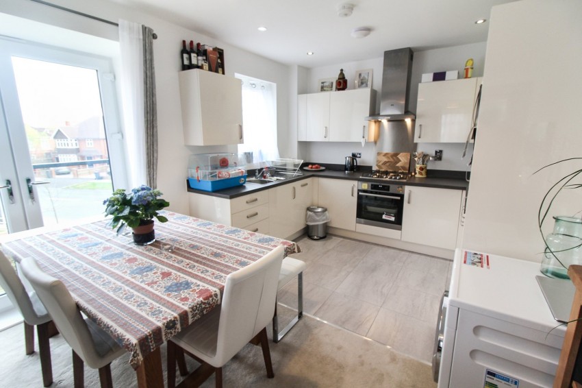 Kitchen - Tiled flooring, range of base and eye level units, downlights, one and a half sink with drainer, gas hob with oven and extractor hood, extractor fan, integral fridge freezer, dishwasher and washing machine.