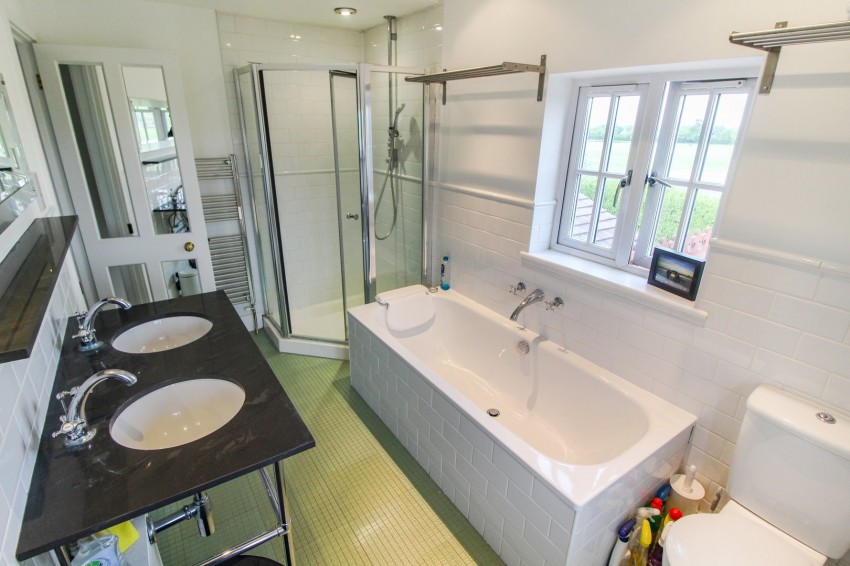 13' 0" x 7' 3" (3.96m x 2.21m) Front and side aspect double glazed windows, low level wc, two wash basins, enclosed bath, separate shower, heated towel rail, downlights, extractor fan, storage cupboard, shaving point.