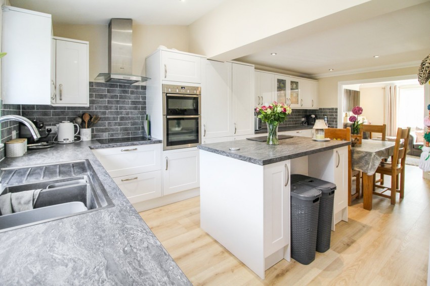 19' 5" x 12' 9" (5.92m x 3.89m) Laminate wood flooring, range of base and eye level units, one and a half sink with drainer, electric hob with extractor fan, built in double oven, built in dishwasher, built in fridge freezer, built in wine cooler, rear aspect double glazed window, downlights, double radiator, door leading into rear garden.