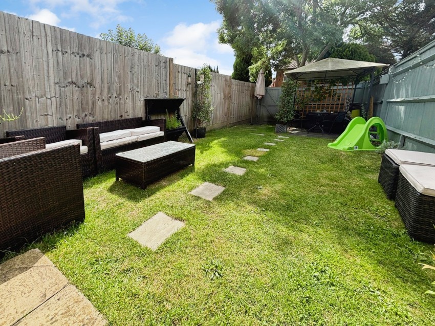 Fence enclosed rear garden with patio slabbed area leading onto a good sized lawn.