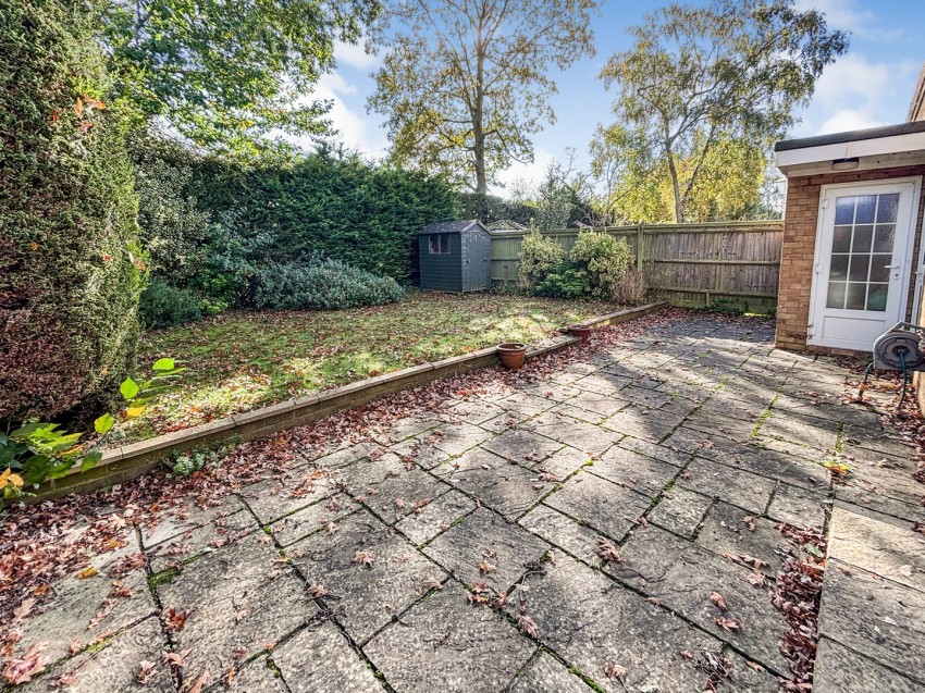 Enclosed rear garden, slabbed patio area leading onto lawn, surrounded by mature shrubs and bushes.